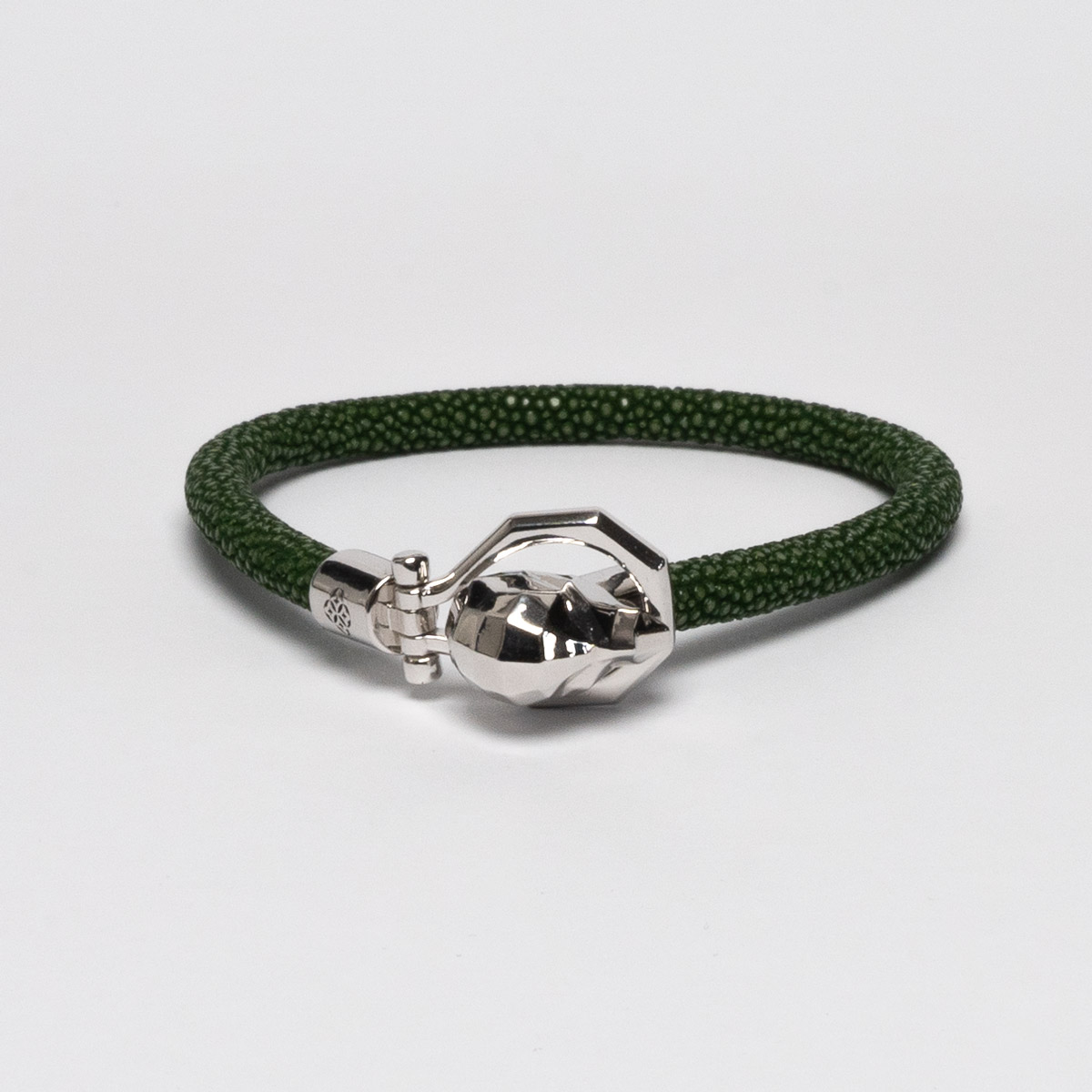 The green stingray leather bracelet offers a perfect blend of luxury and uniqueness. Inspired by nature, this deep green shade radiates tranquility, balance, and refinement. Its signature pearl-like texture and impeccable craftsmanship make it a timeless accessory for those who appreciate understated elegance.